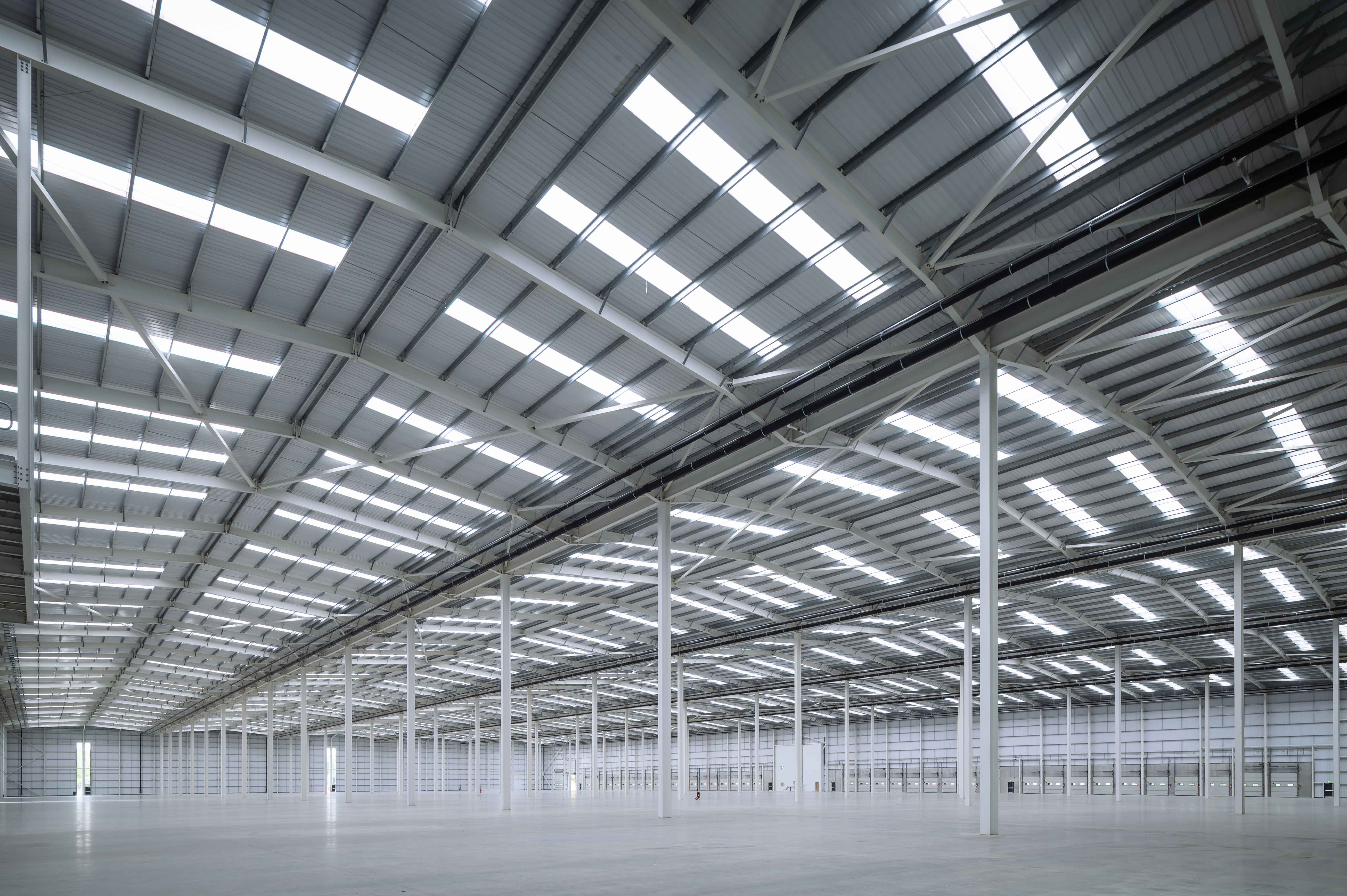 The warehouse building consists of a structural steel multi span portal frame having a clear height to the underside of haunch of 15m.