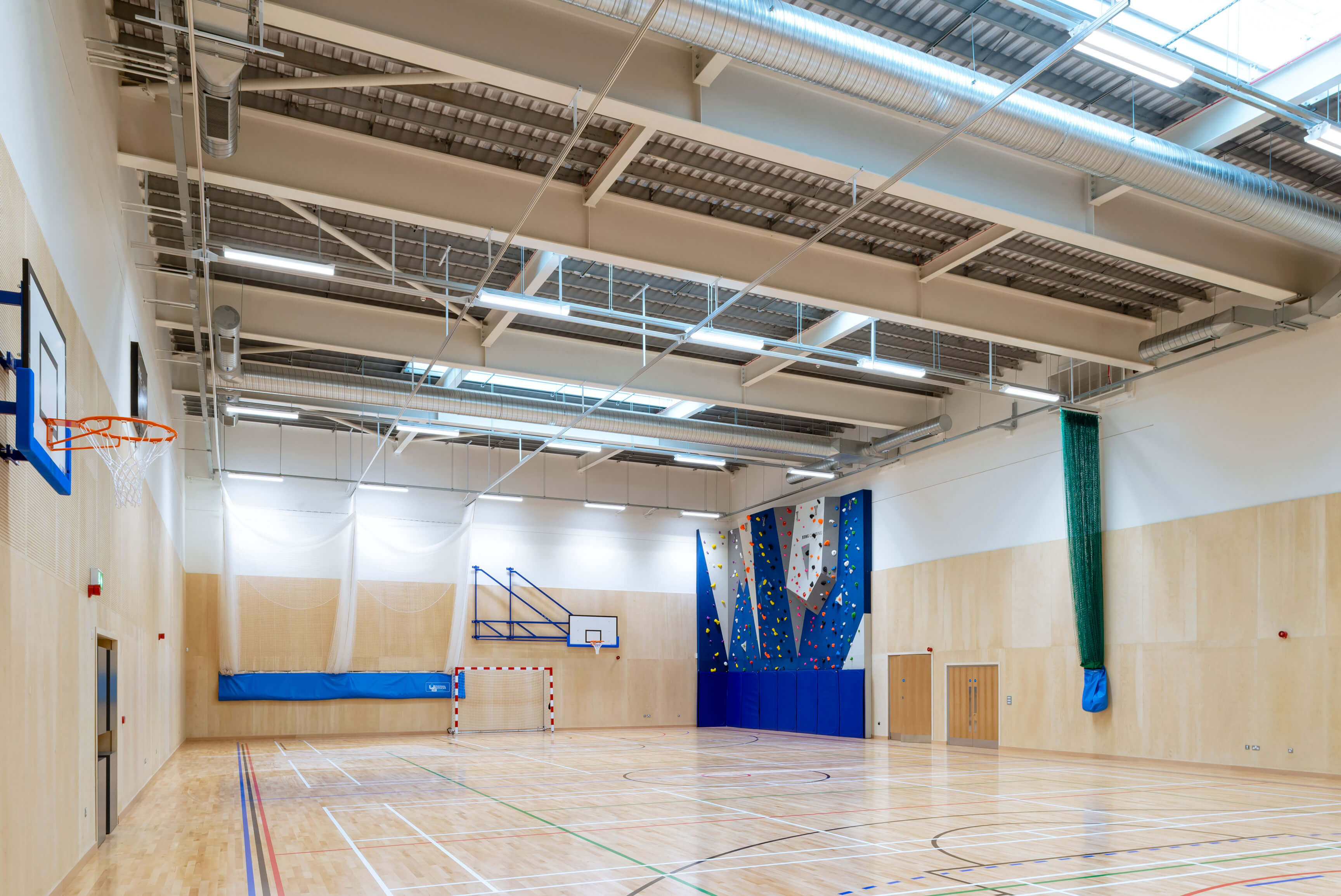 The four-storey secondary school has a separate sports hall and dance and drama studios. Extensive infrastructure upgrades to local roads and pedestrian routes were required and new grassed pitches – finished to Sports England standards were laid; a MUGA pitch, staff parking, cycle storage, courtyard open space and general circulation spaces completed the project.