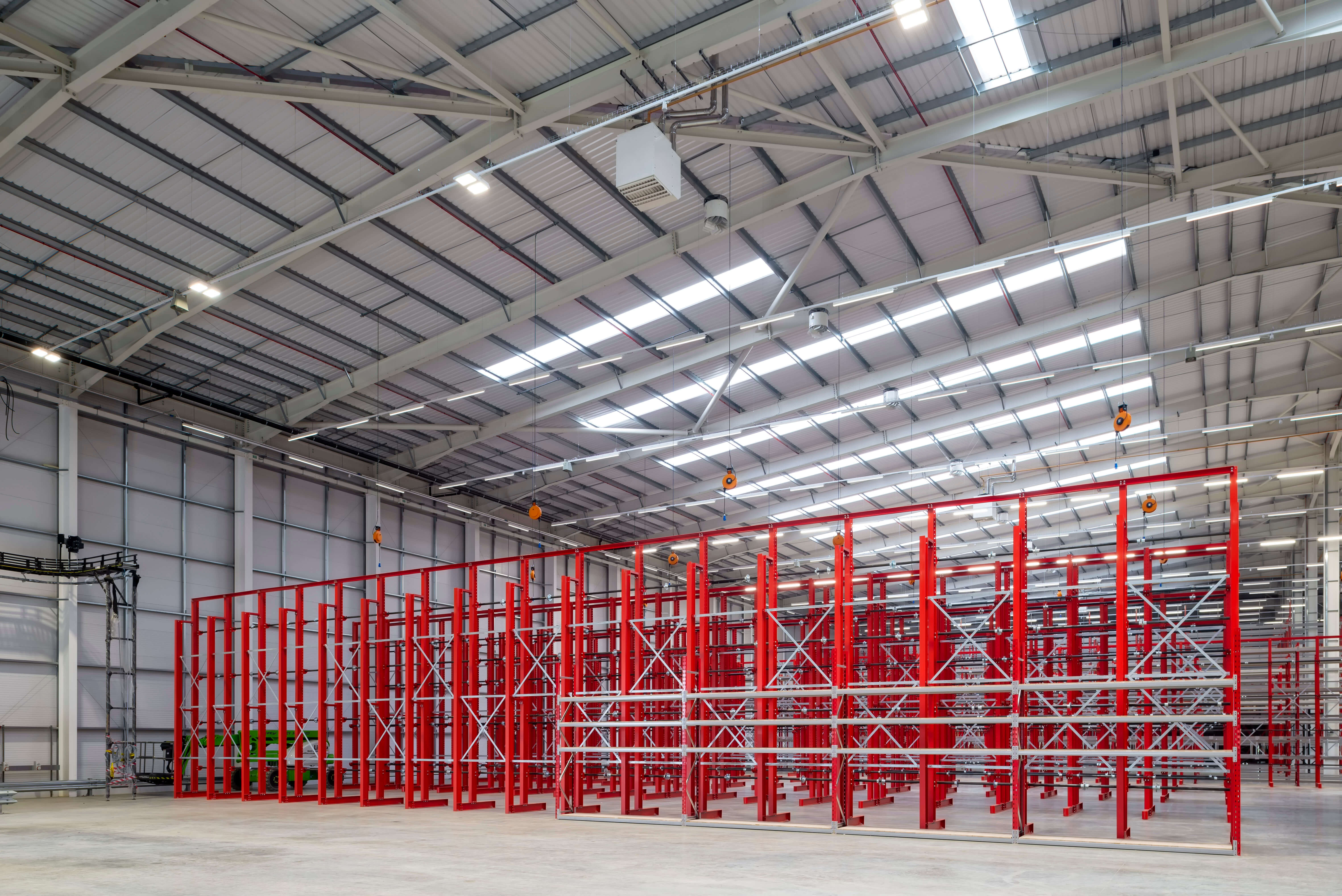 The warehouse element of the build is a single-storey construction with dimensions appropriate for loading, unloading, and movement of goods and people. The frame design includes a 12m haunch. Within the 9,000m² of space, there is a two-storey mezzanine floor constructed from lightweight chipboard. As well as the lighting, cooling, and plumbing, the warehouse is also fitted with very narrow aisle (VNA) pallet racking, cable reel racking, and shelving on the mezzanine floor. To the rear of the warehouse, there is a 4.5m cantilever canopy covering the five standard loading docks and four level access doors.