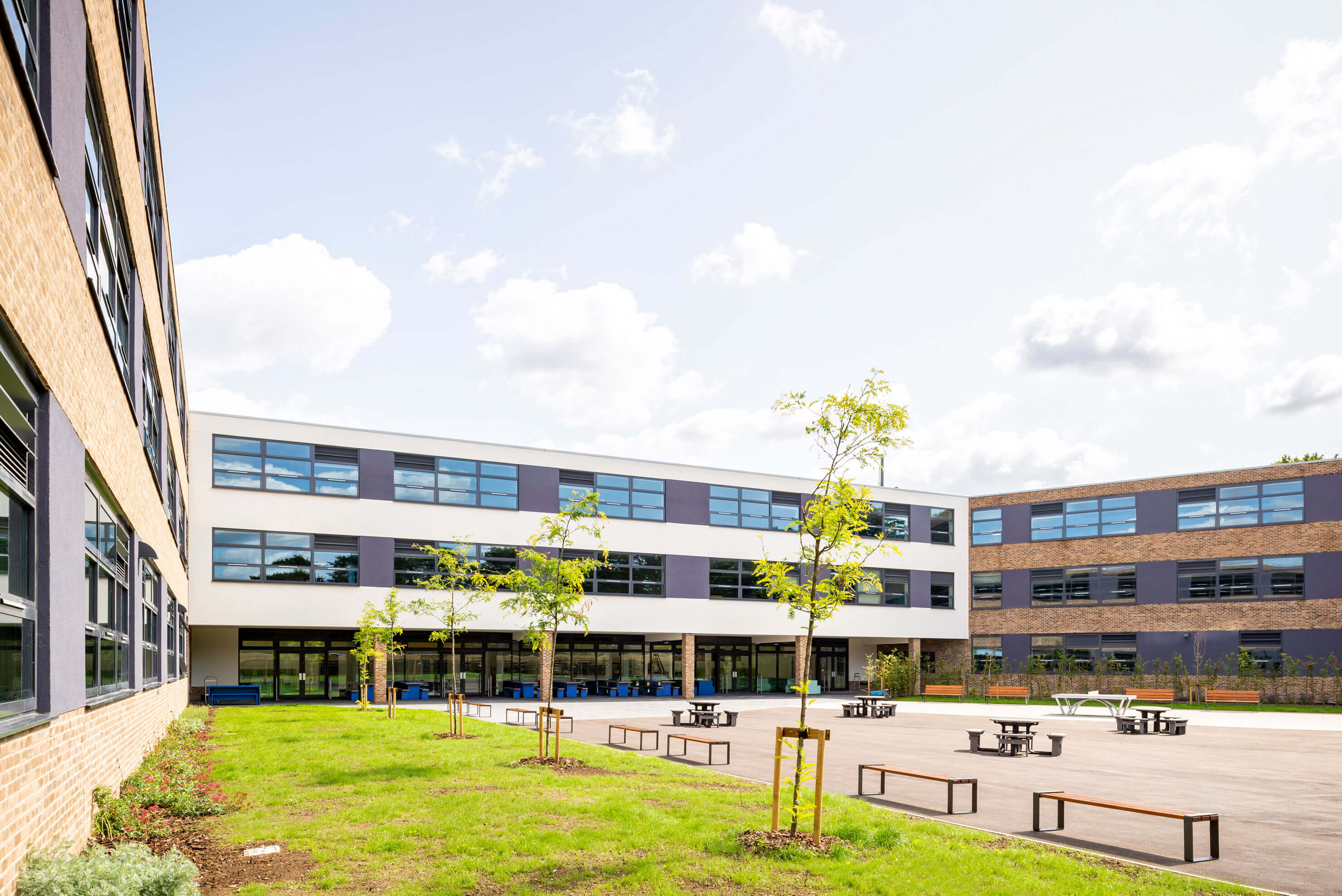 The project involved the construction of a three-storey secondary school with a separate sports hall, incorporating dance and drama studios. The project also has associated external works including a full size 3G floodlit pitch and external grassed pitches – all finished to Sports England standards, a MUGA pitch, staff car parking, cycle storage, external classroom, courtyard open space and general circulation spaces.