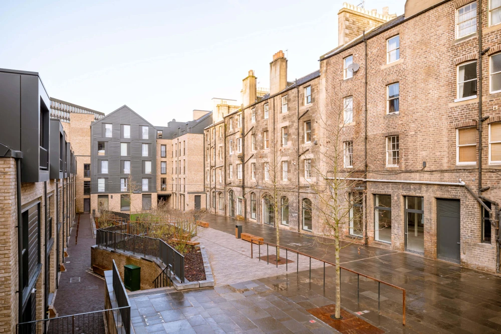 The hard landscaping surrounding the site is in keeping with Edinburgh Old Town utilising Caithness Paving, Whinstone Kerbs and granite steps and walls. Rain gardens and grassed areas, planters and trees provide green and biodiverse spaces within the development, which is accessible to the public albeit under private management. The Public Realm (Hotel Courtyard) provides a relaxing space for guests as well as potential customers and staff from the commercial units. The Tilt and Stables are a focal point within the courtyard areas, highlighted by feature LED lighting, to create an ambiance where the new and old developments tie together.
