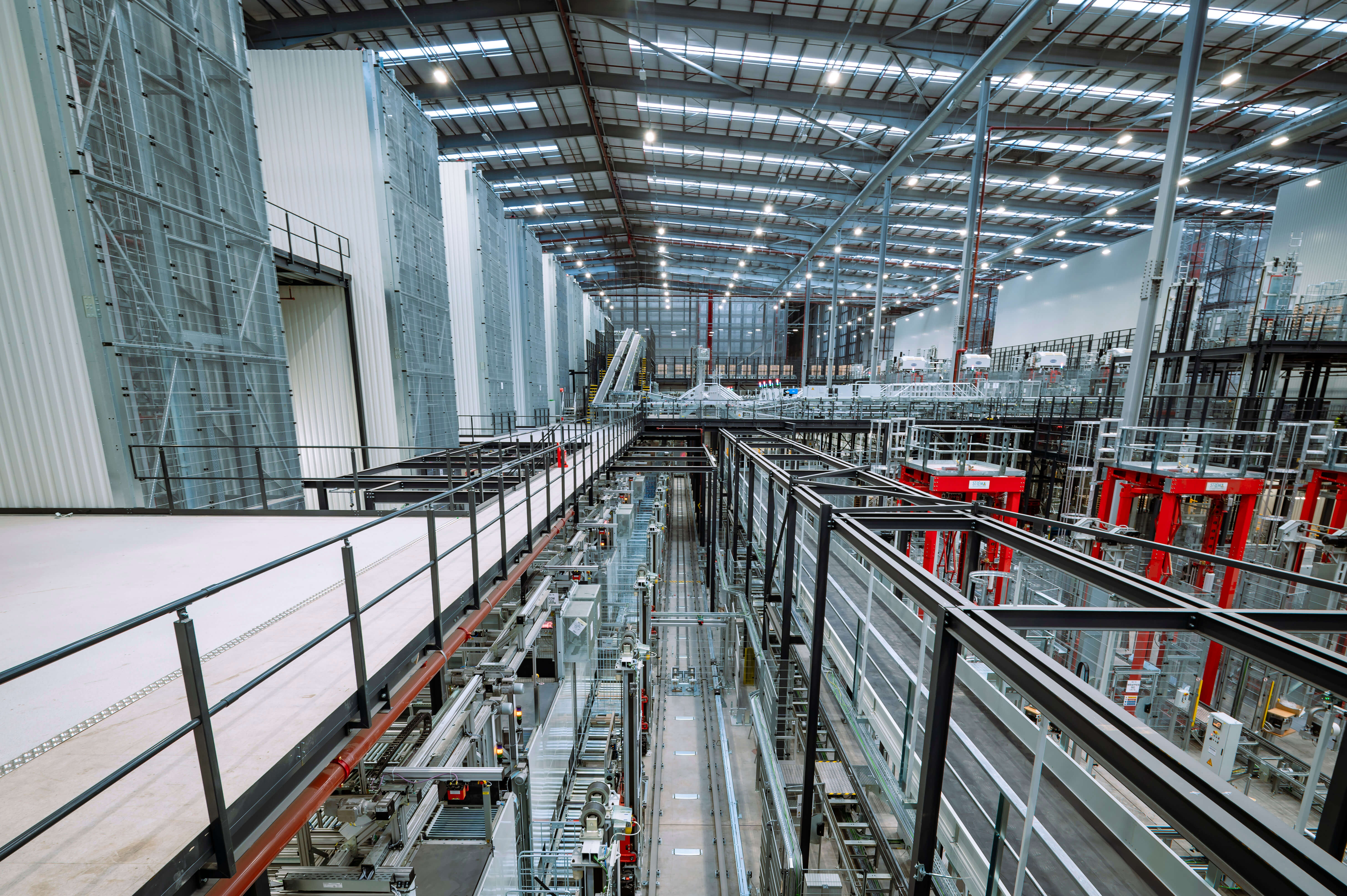 A critical success factor was the floor slab design, tailored to meet the MHE system's strict settlement and performance criteria. Over 14,000 precast driven piles with “mushroom” heads were installed with tight settlement limits, supporting suspended, fibre-reinforced slabs with a differential settlement tolerance of just 1:2500. An innovative construction sequence allowed early erection of the low bay frame, which provided temporary stability for the high bay steelwork, ensuring smooth progress despite height and column spacing complexities.