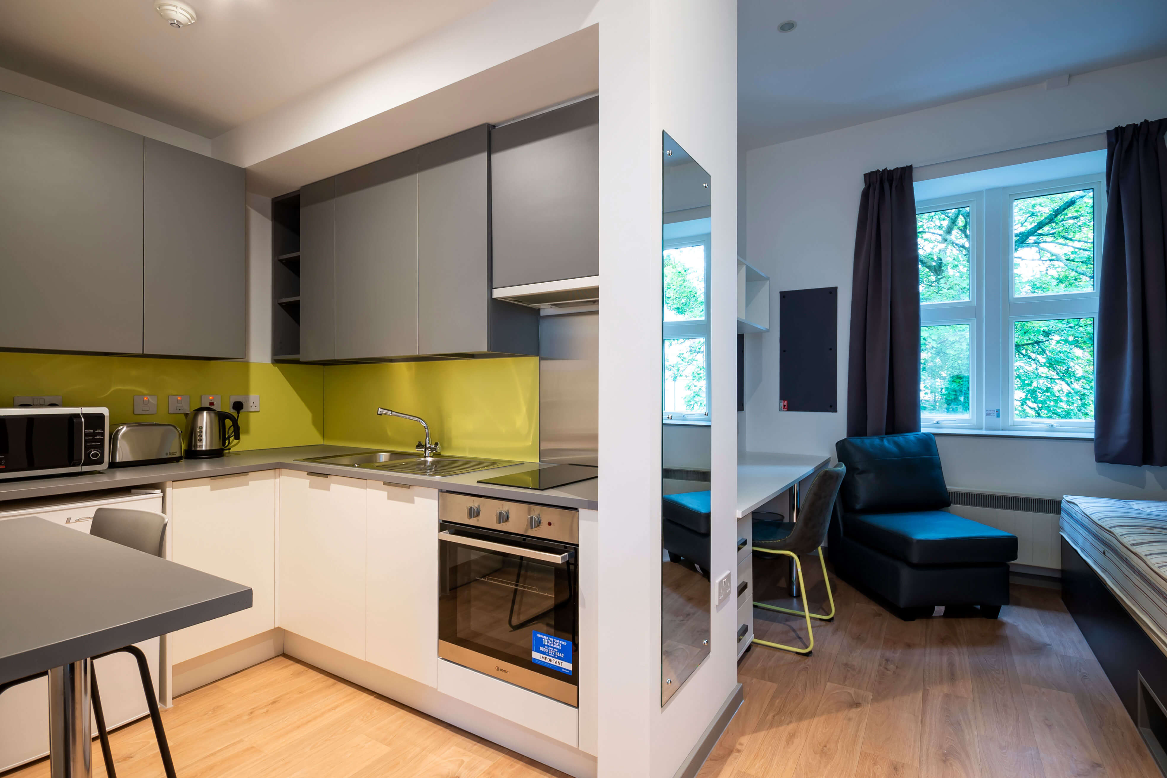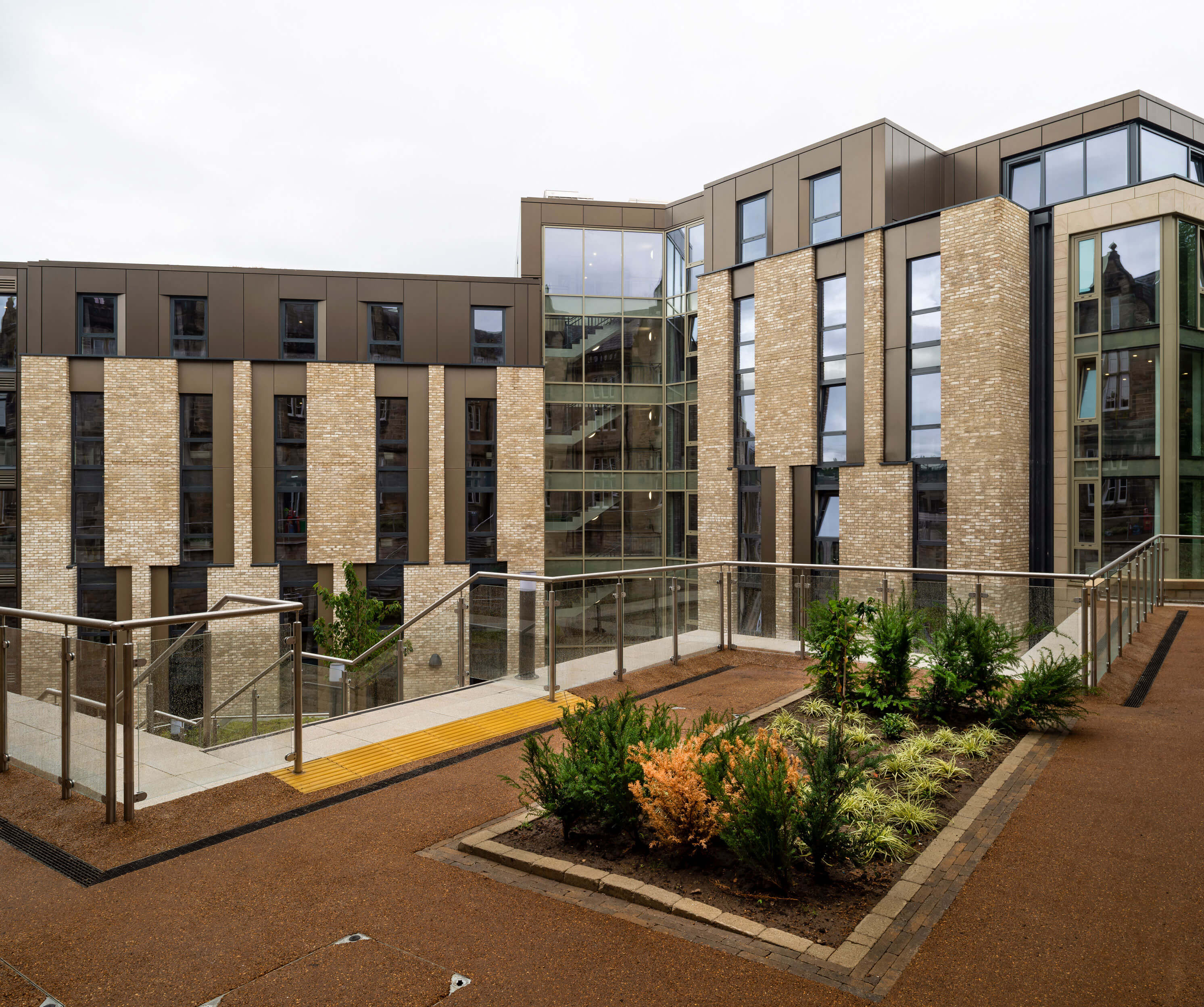 As well as selected demolitions and restructuring of the hospital building, there was additional new building work undertaken. Two new purpose-built blocks of student flats were constructed, providing 282 rooms and associated communal spaces. In addition to the new flats, further extensions in the internal courtyard allowed for the creation of 82 studio living spaces. An existing Scout Hut was rebuilt and repurposed as a student amenity building and the whole site was given improved access, parking, cycle stores, and landscaping.