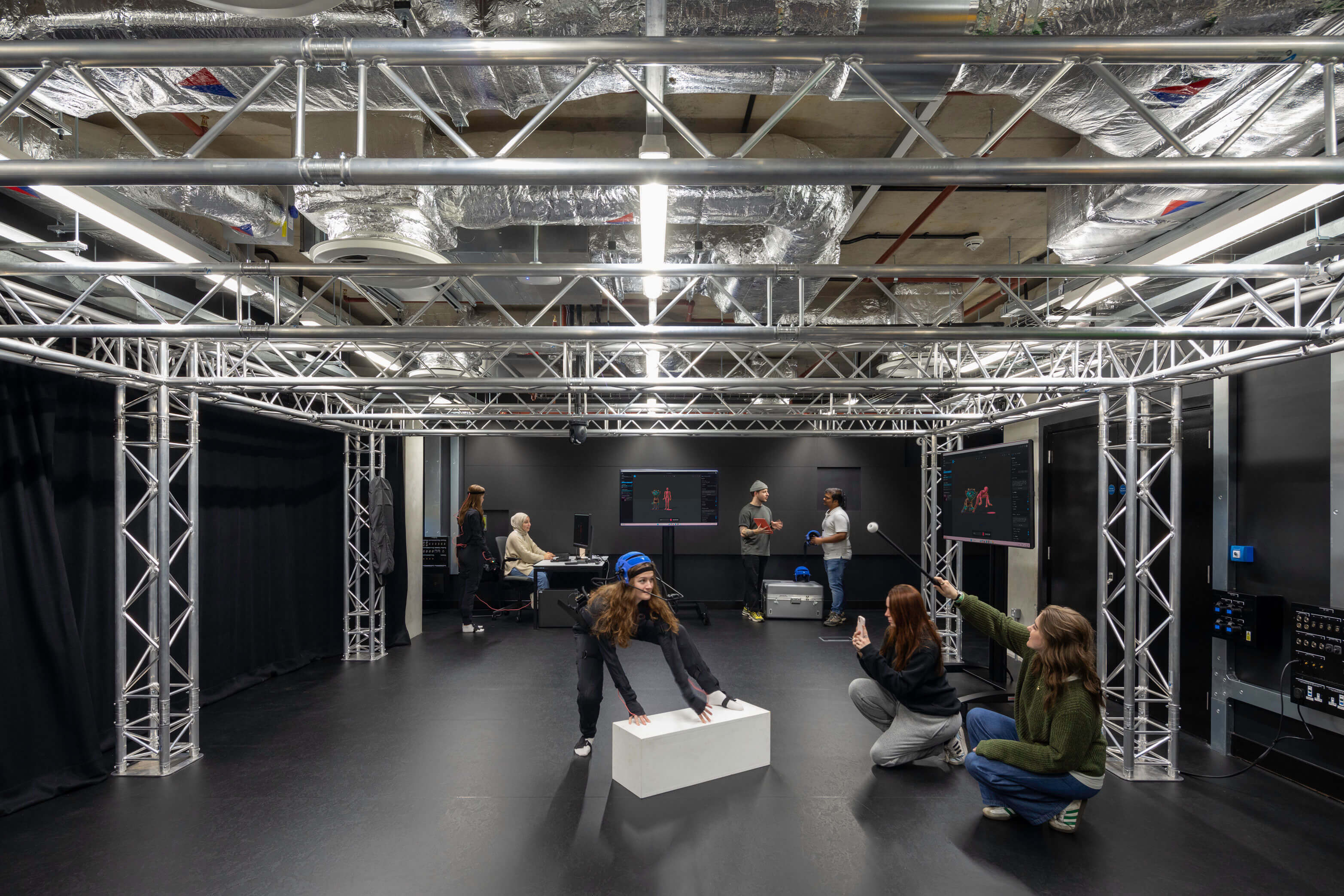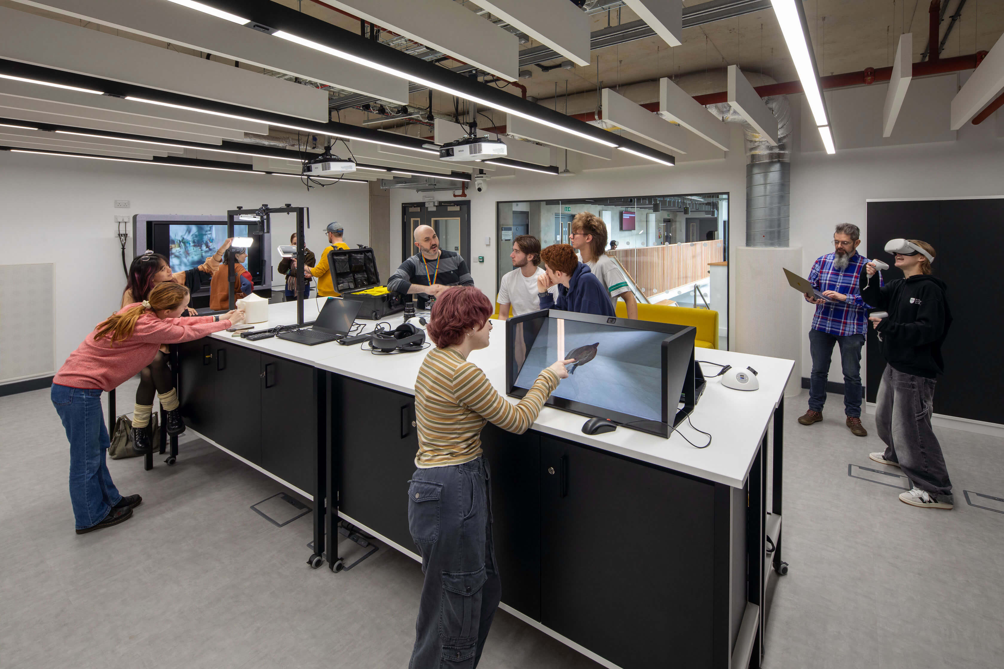 The facilities provided include collaborative studio spaces, a Digital Innovation Lab and VR Studio, exhibition spaces, a TV and Film Studio, a Black Box studio, film production editing suites, a screen printing room, sound studios, and a Stop Motion Studio.