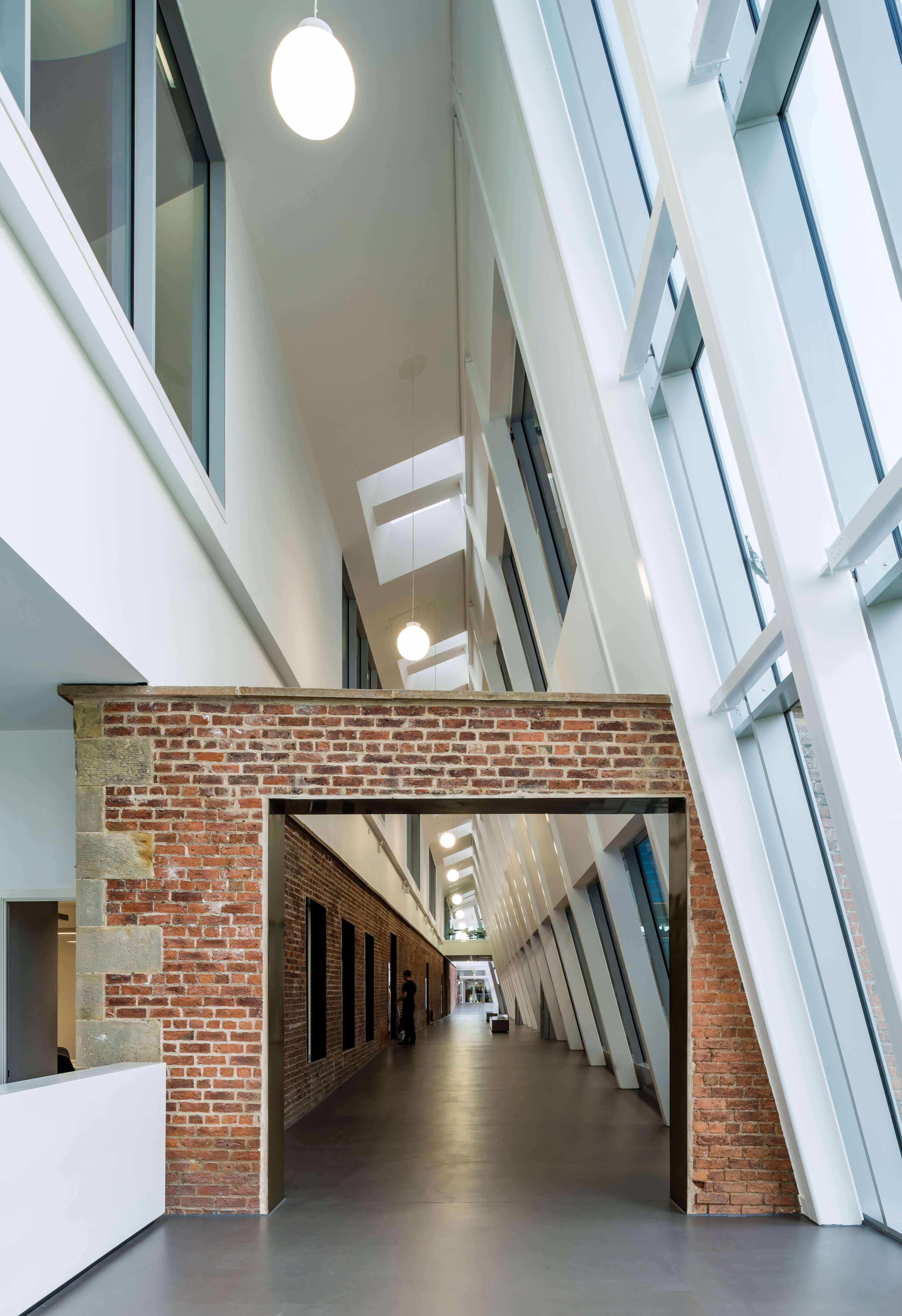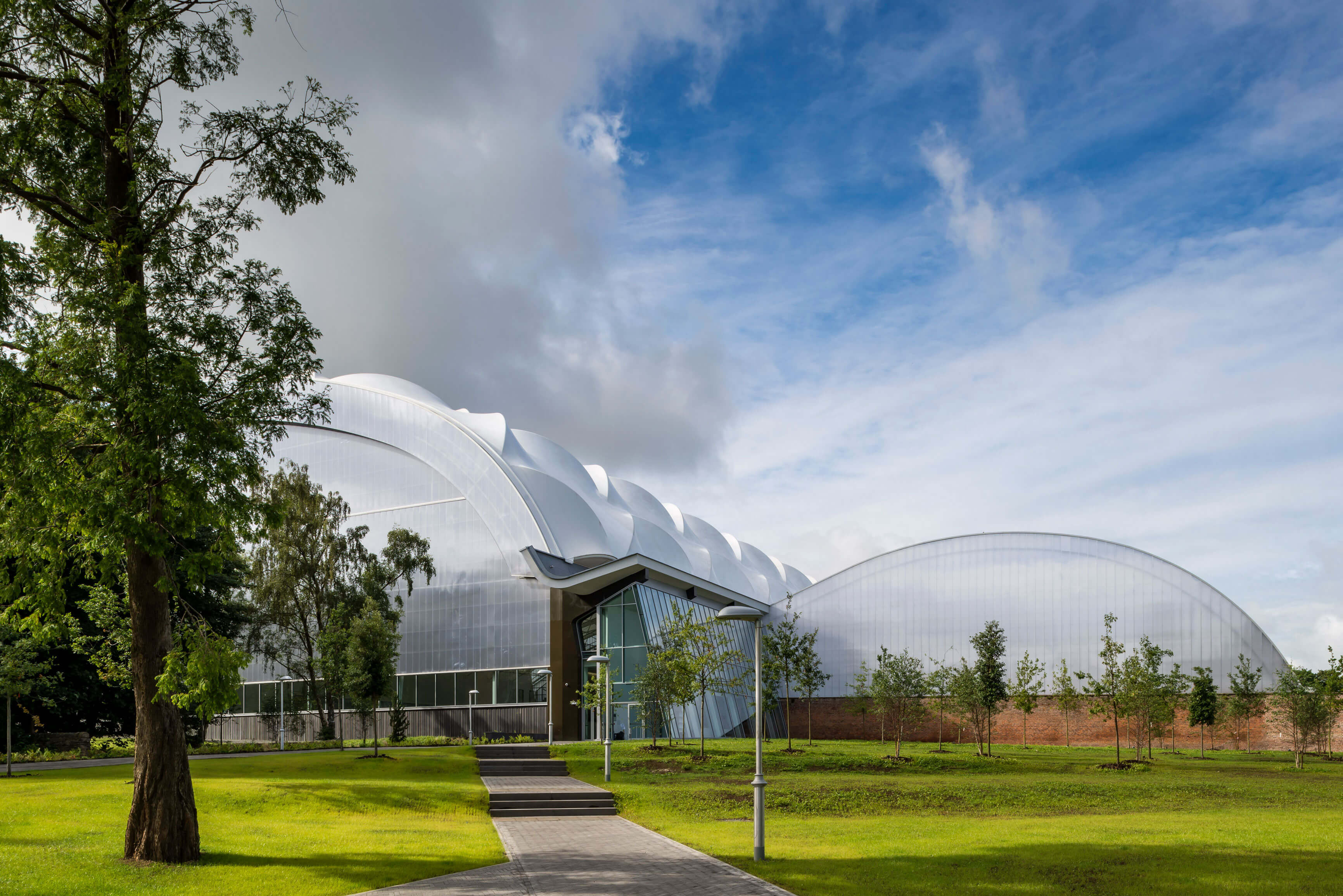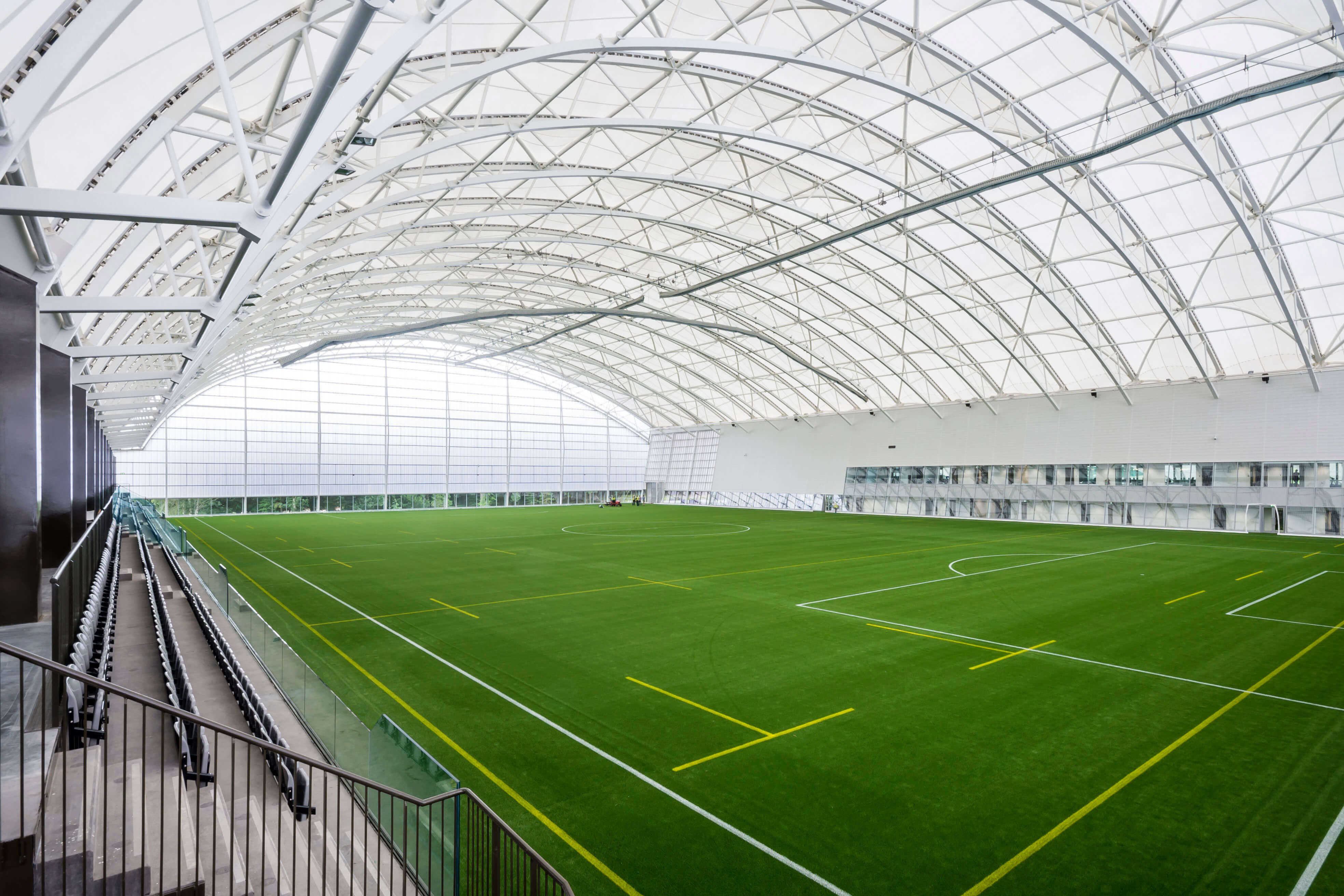 The football hall contains a full UEFA size 3G pitch and fixed seated viewing for 499 people. The roof over the hall is covered with a lightweight coated fabric that allows in high levels of natural light and provides a particularly attractive roof form. The overall height over the centre of the pitch is 25m.