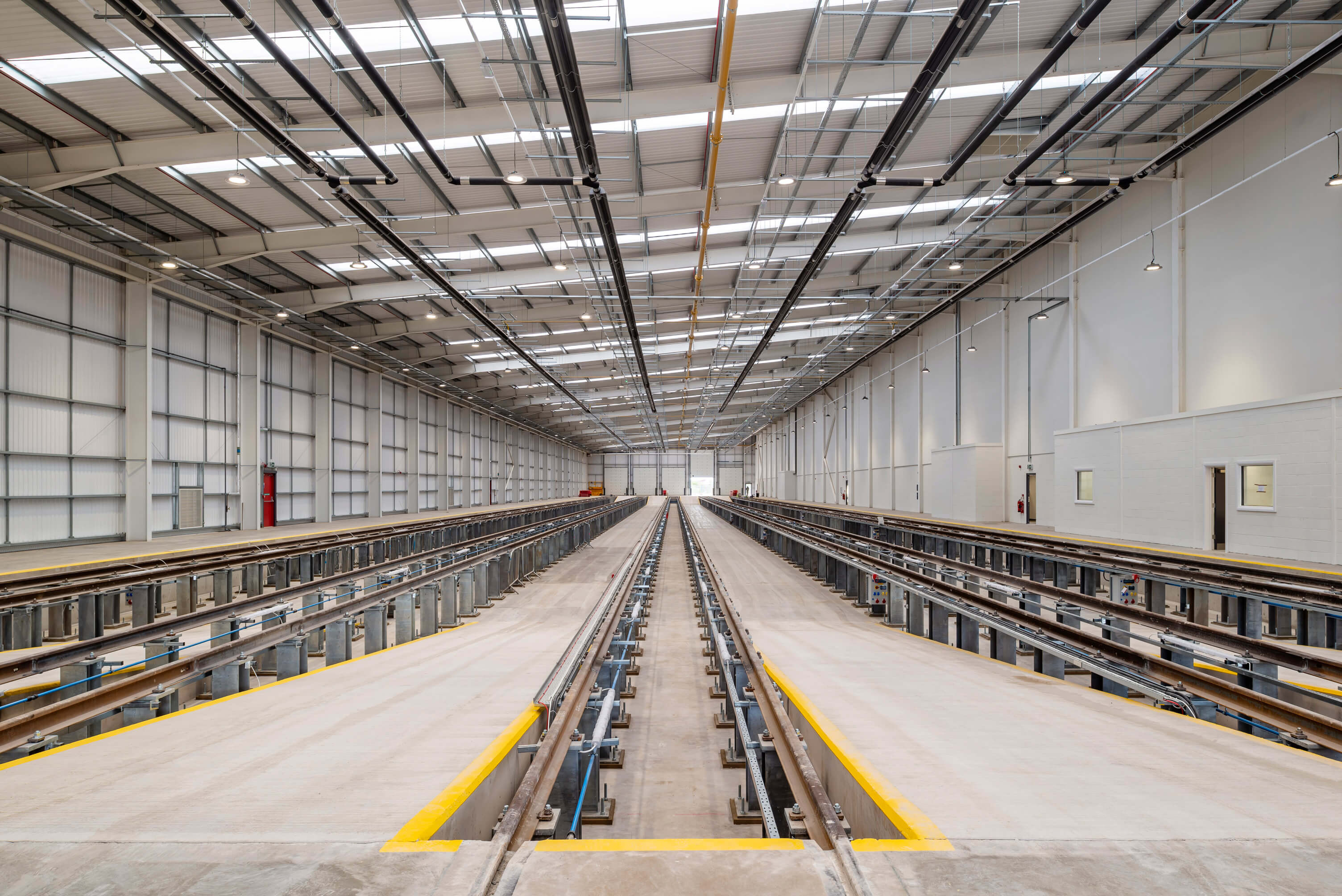The main facility is 175m long by 81m wide with external yard areas including both embedded track and railway ballasted sections. Site staff also have a two-storey office including reception, open plan offices, canteen, and plant room. The design has provision for an additional storey to be added in the future, should it be required. Within the main facility there are also further small accommodation areas including a workforce office, quality department, and a dispatch office. The live working area comprises a warehouse, final assembly area, and testing bay.