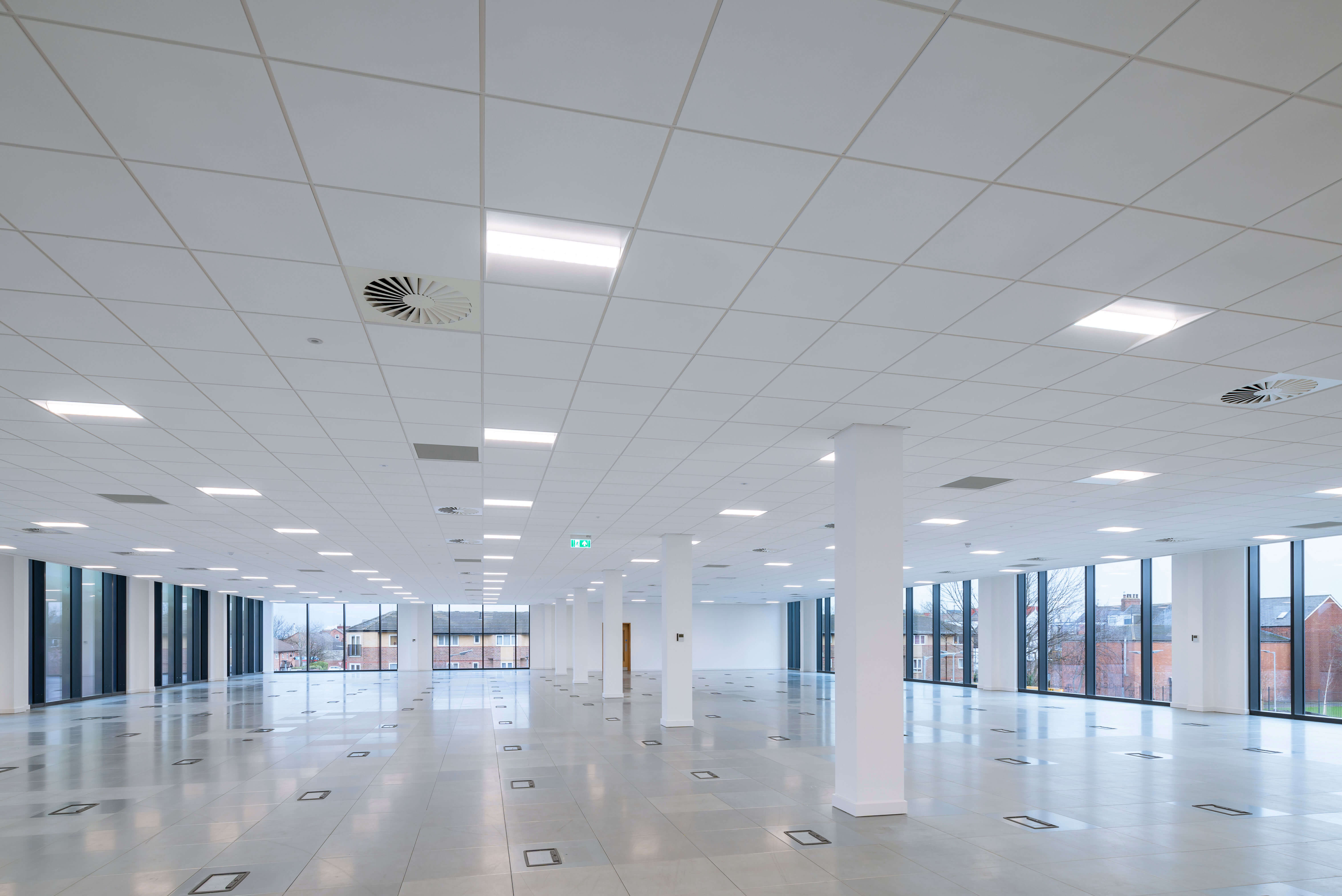 The building has a simple rectangular floorplate with core to the western end which creates large efficient and flexible open plan areas ready for a variety of potential fit outs. The double-height entrance is prominent entrance as the building is approached from centre Square.