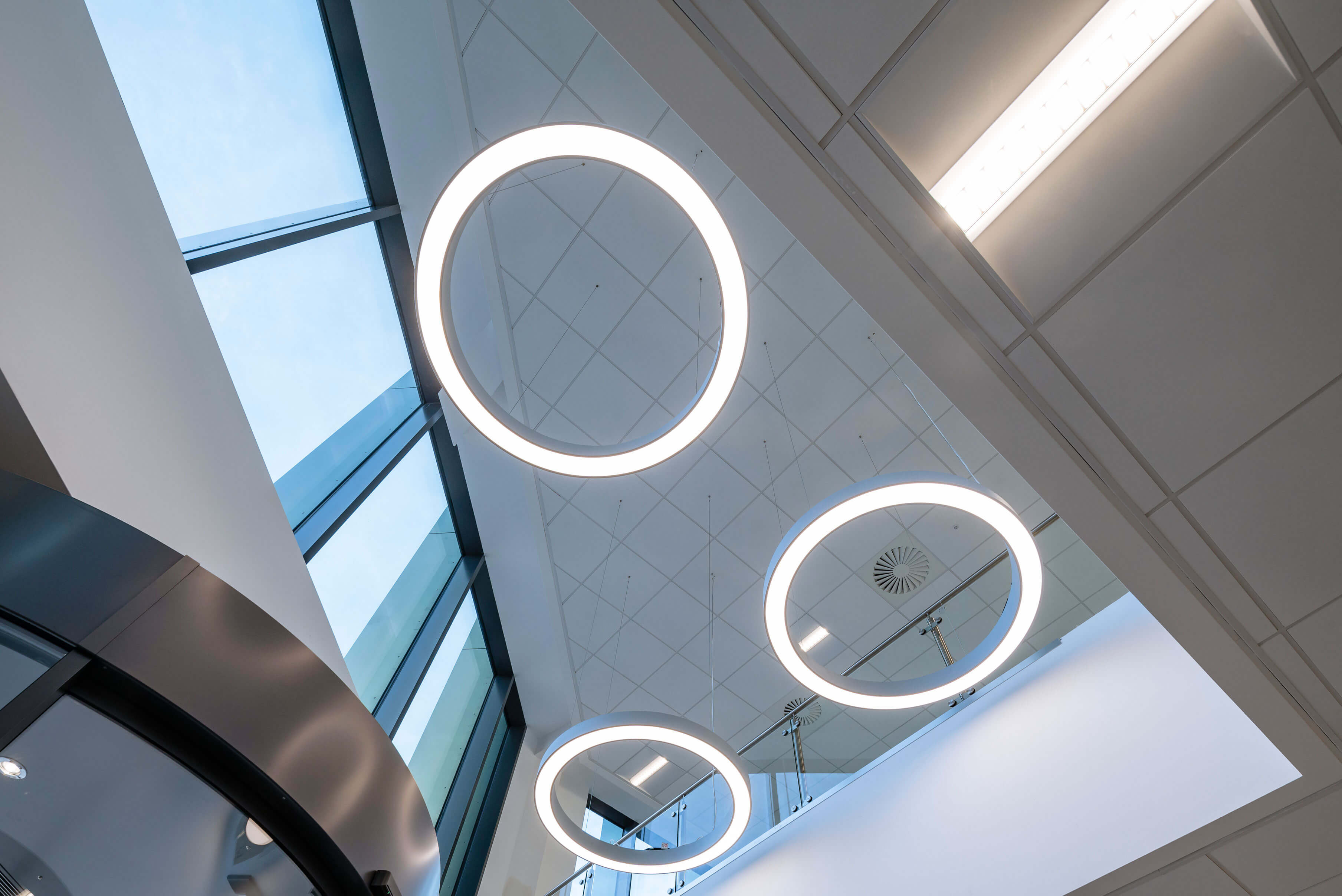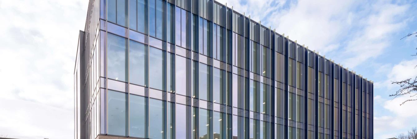 Externally a dark brickwork frame to ground floor contrasts with the iridescent cladding and glazing to the upper three storeys, combined with the protruding fins to north elevation, the cladding interacts with the changing light to ensure the building looks stunning from every angle.