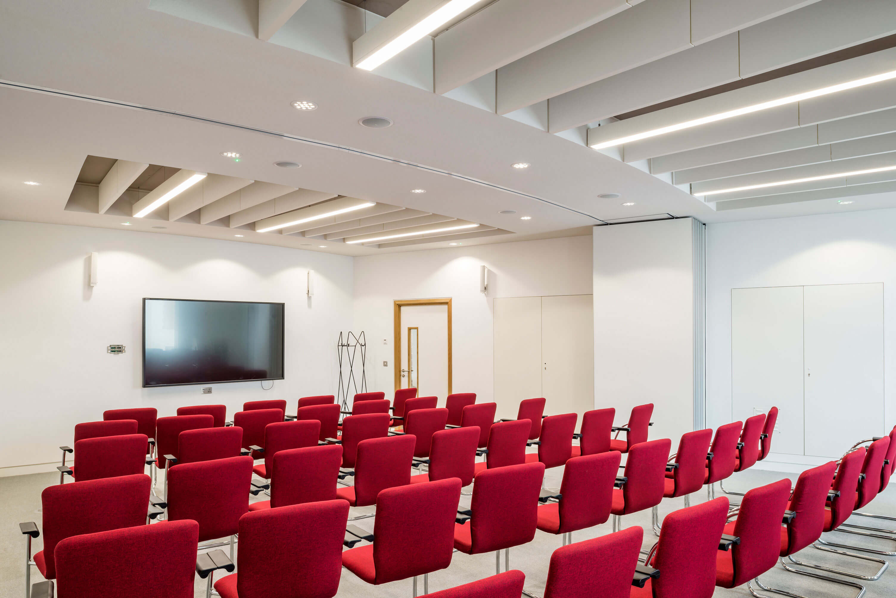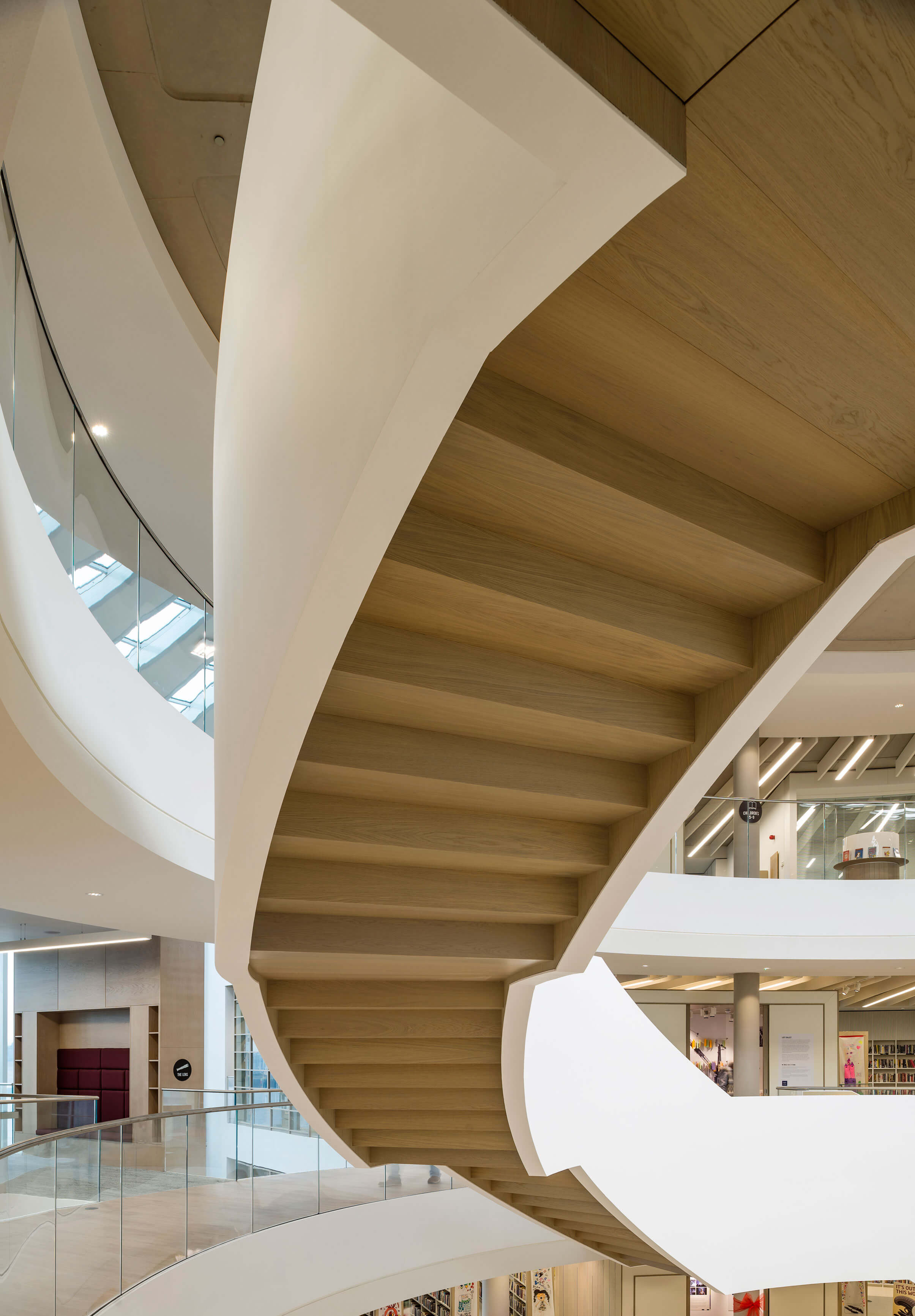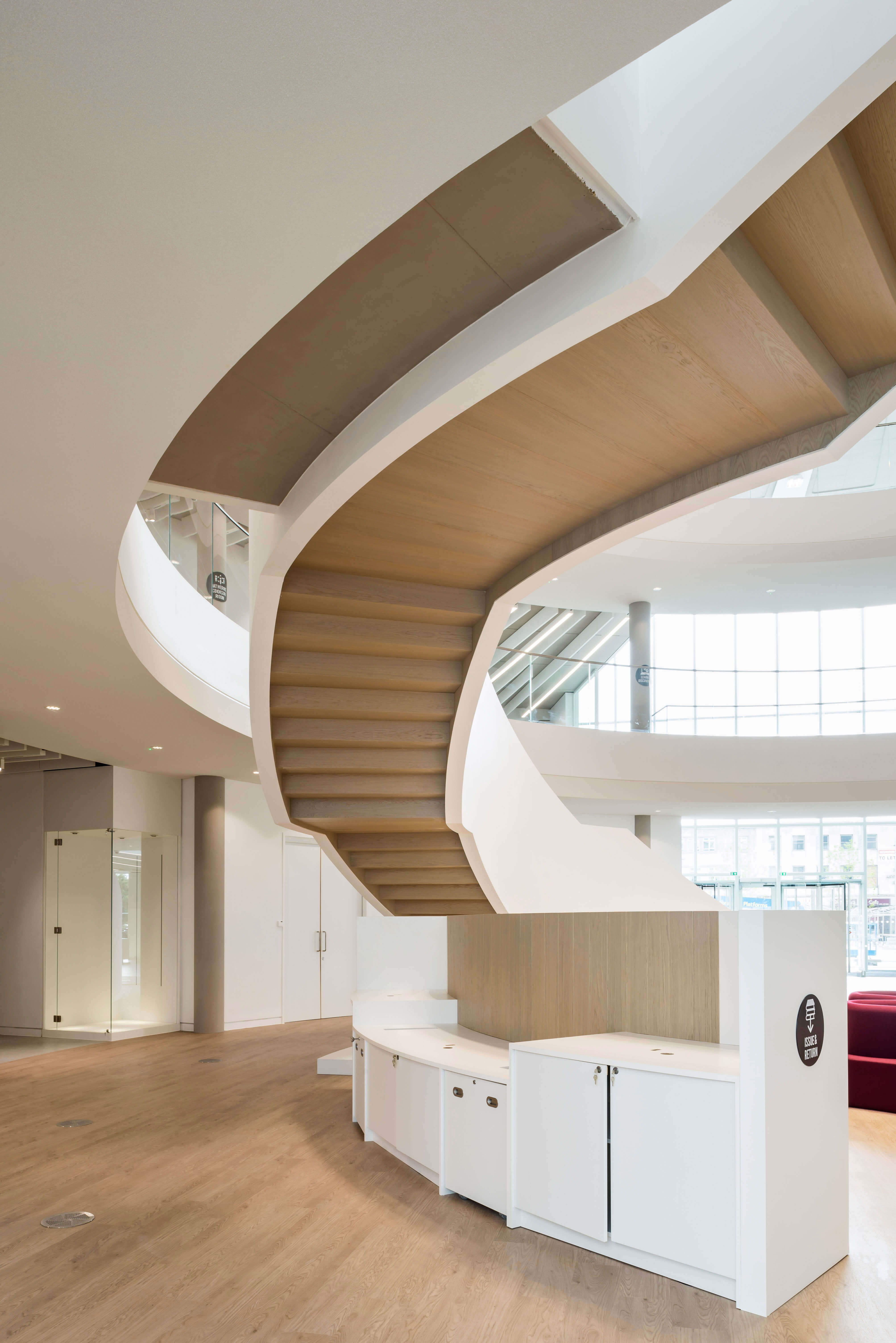 High specification bespoke joinery features throughout the building including a curved feature staircase spiralling through the main atrium space in the centre of the building. The main structural frame of the building is high quality exposed in-situ concrete with exposed circular columns and slab soffits. There are structural steelwork elements to the main entrance facade to support glazed walling systems.