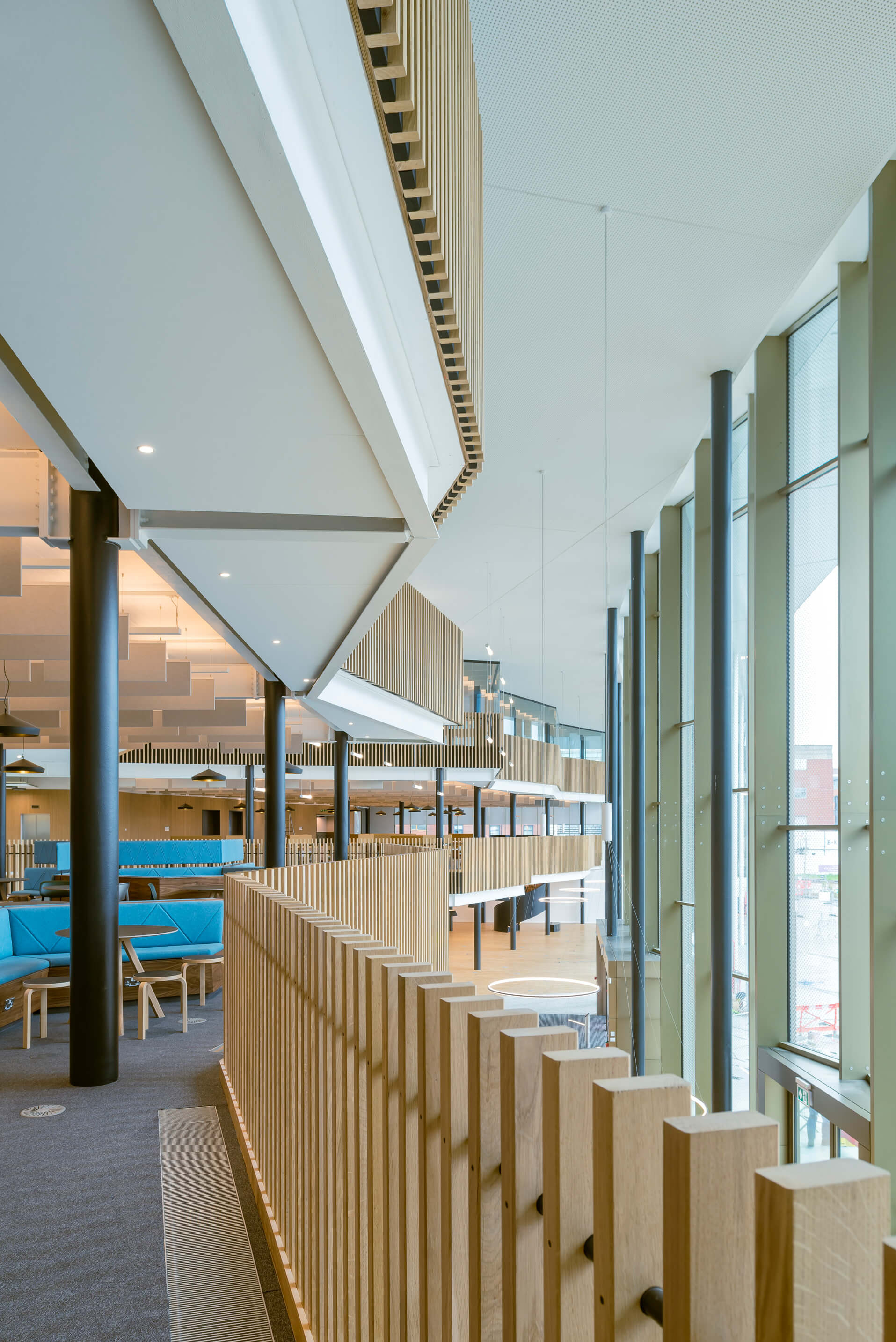 Internally, there is full height, open space with a dramatic atrium complimented by a lighting installation. This area forms the social heart of the centre and is accompanied by informal learning spaces and a wellbeing support centre.