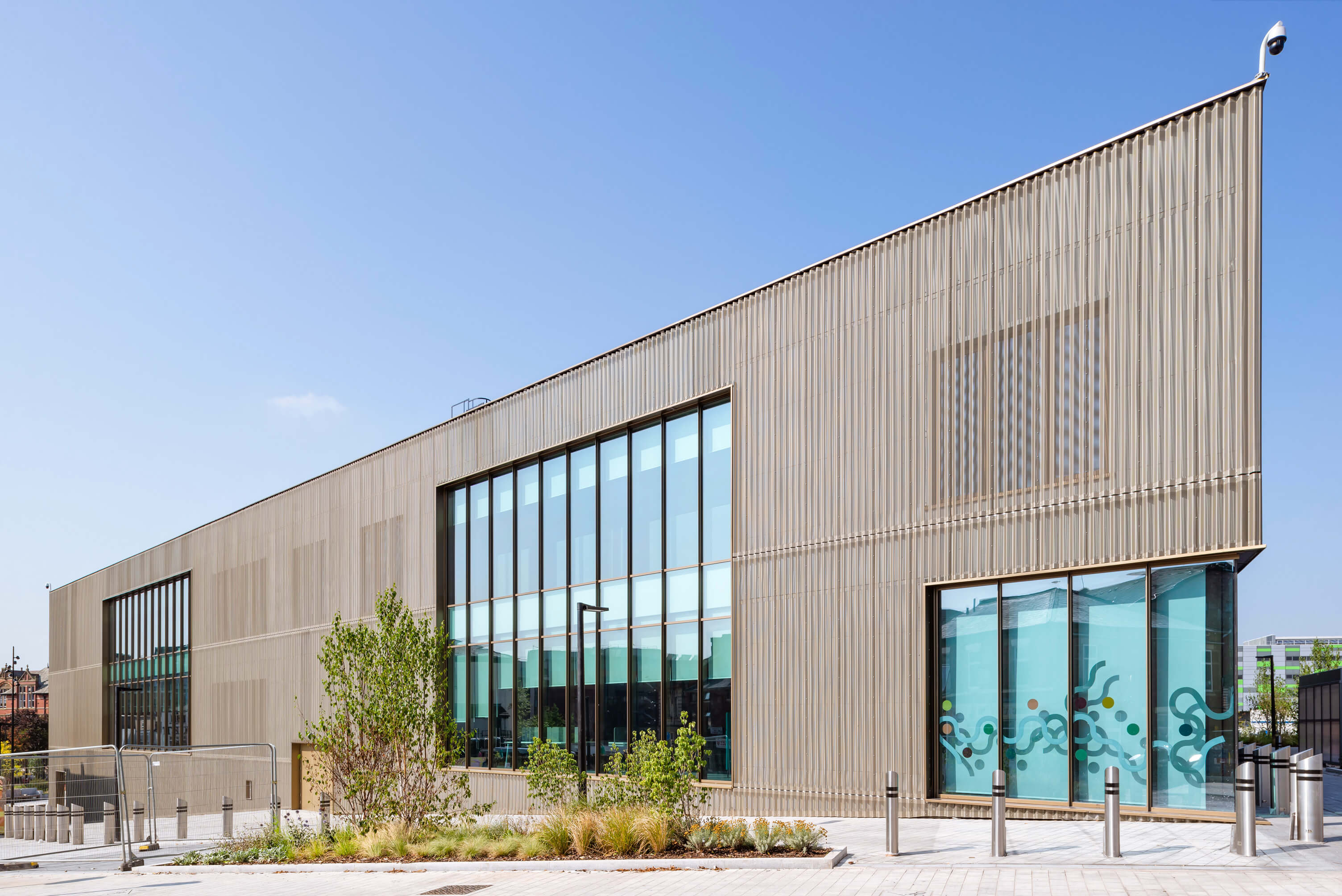 The building includes a reception area, learning spaces, student wellbeing support centre and roof-terrace and garden over a four-storey steel framed structure. The envelope consisted of a combination of curtain walling, rainscreen cladding and precast concrete panels.