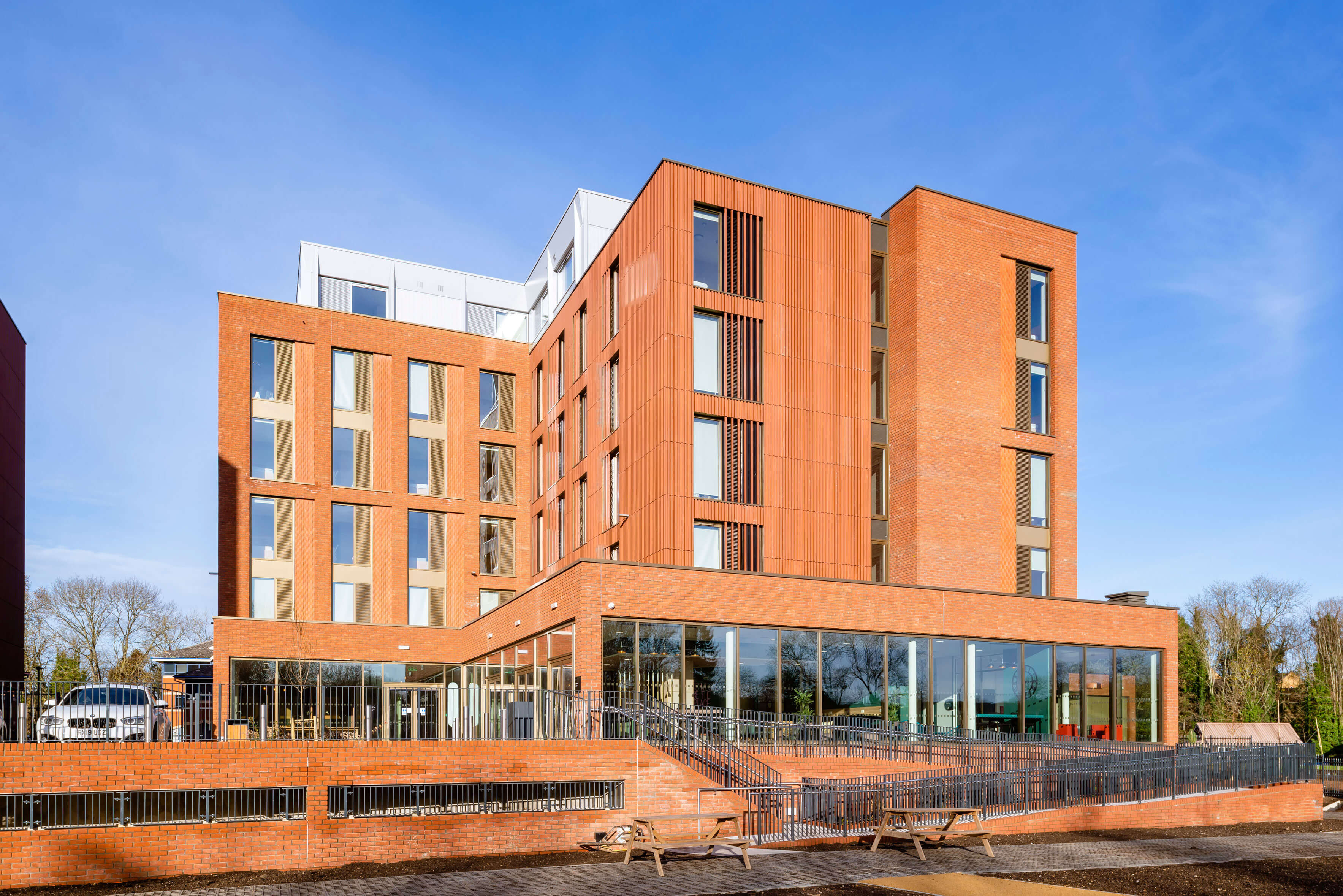 The existing site comprised a motor dealership and old office buildings located by the River Wey within an area of flood risk. The ground was left in a contaminated state and ground remediation works were required to remove ground water, hydrocarbons and asbestos.